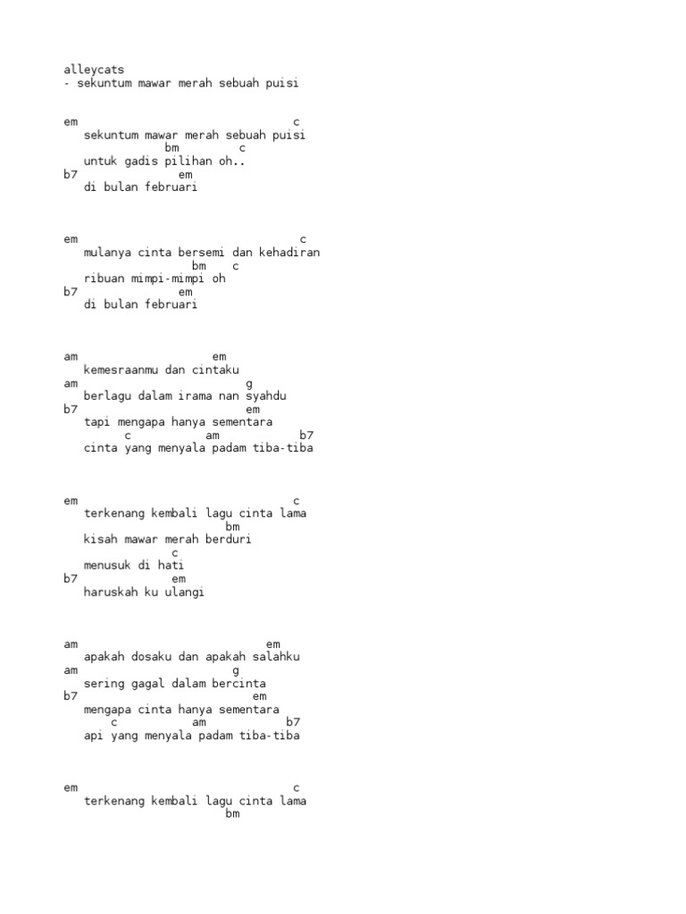 Em C Sekuntum mawar merah sebuah puisi Bm C Untuk gadis pilihan oh. Sekuntum mawar merah Sebuah puisi Untuk gadis pilihan oh. Oh di bulan Februari Mulanya cinta bersemi Dan kehadiran Ribuan mimpi-mimpi Oh di bulan Februari Kemesraanmu dan cintaku Berlagu dalam irama nan syahdu Tapi mengapa hanya sementara.
